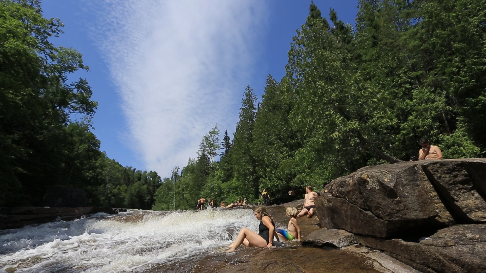 Un peu au nord de Saint-Siméon, sur la 170, direction Saguenay, on aperçoit soudain une longue file de voitures garées sur les bords de la route, côté ouest. Curieux, on s'y arrête: en longeant les autos, on finit par découvrir un discret petit sentier qui s'enfonce dans les bois. On l'emprunte: bien vite, on entend le bruissement d'une rivière, le grondement d'une chute, des cris et des rires, des gens qui s'amusent ferme. Et soudain, on les voit: les quatrièmes chutes, bouillonnantes mais sûres, rieuses sous le chaud soleil du mois d'août. Sur les grands rochers qui la bordent, les jeux malicieux des enfants côtoient la calme immobilité des corps bronzés. Dans les eaux de la Rivière noire, qui en cet endroit porte bien mal son nom, on plonge et on s'égaye, on s'éclabousse joyeusement, on paresse langoureusement, dans une fraîcheur bienvenue... Le tout sans surveillance: on part aux quatrièmes chutes comme les trappeurs partaient autrefois en Huronie, en aventurier, à ses risques et périls - le risque du coup de soleil et le péril du fusil à l'eau des enfants, s'entend... Pour le reste, les Quatrièmes chutes ne promettent - et n'offrent! - que du plaisir! Go-Xplore vous invite à découvrir cette merveille cachée de Charlevoix, bien connue des locaux qui savent qu'on y passe les plus belles journées d'été imaginables. Bref, les Quatrièmes chutes, c'est Ze Spot, comme disent les Français!